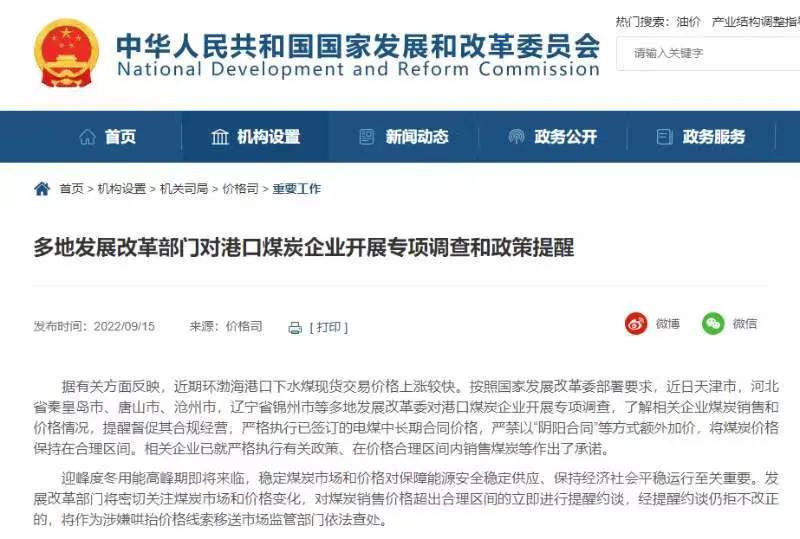 此外,9月份,针对环渤海港口下水煤现货交易价格上涨较快,在国家发展改革委部署要求下,天津市,河北省秦皇岛市、唐山市、沧州市,辽宁省锦州市等多地对港口煤炭企业开展专项调查,提醒督促其合规经营,严格执行已签订的电煤中长期合同价格,严禁以“阴阳合同”等方式额外加价,相关企业已就严格执行有关政策、在价格合理区间内销售煤炭等作出了承诺。